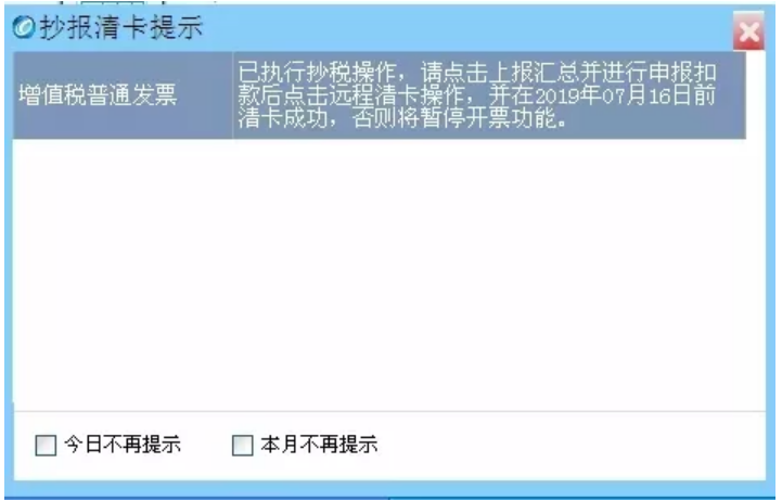 通过上图,我们可以看到,上报汇总已完成,并提示进行申报,申报成功以后才可以进行清卡操作,而且要求必须在7月16日以前完成,否则将无法开票。