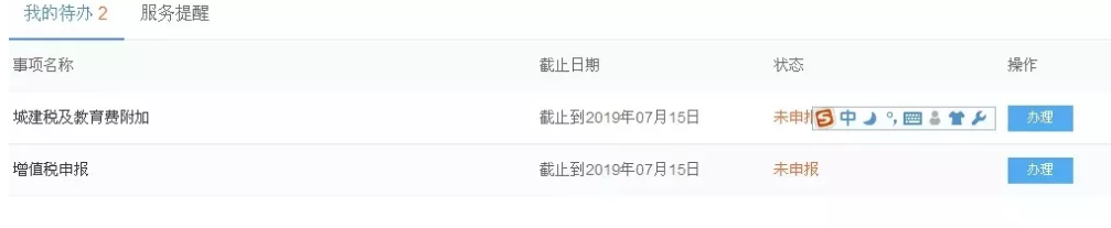 登录进来以后,我们可以看到,在“我的待办”下面,有两项需要待办的事情,我们今天主要是进行增值税申报,因此,在增值税申报的后面,我们点一下“办理”,即可打开小规模增值税申报表