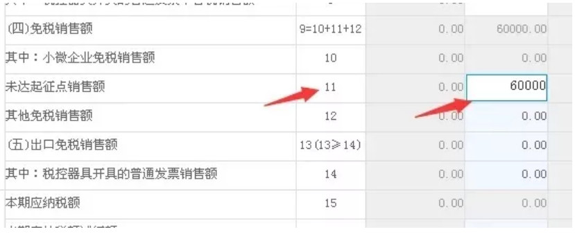 我们找到第11栏,“未达起征点销售额”,然后在本期数填上税局给我们设定的季度定额。例如我上面这个,税局设定的是季度6万,虽然我本季度开票数据达不到6万,但是在本期数这地方,也要输入定额60000。输入以后,点下面的“保存”即可。